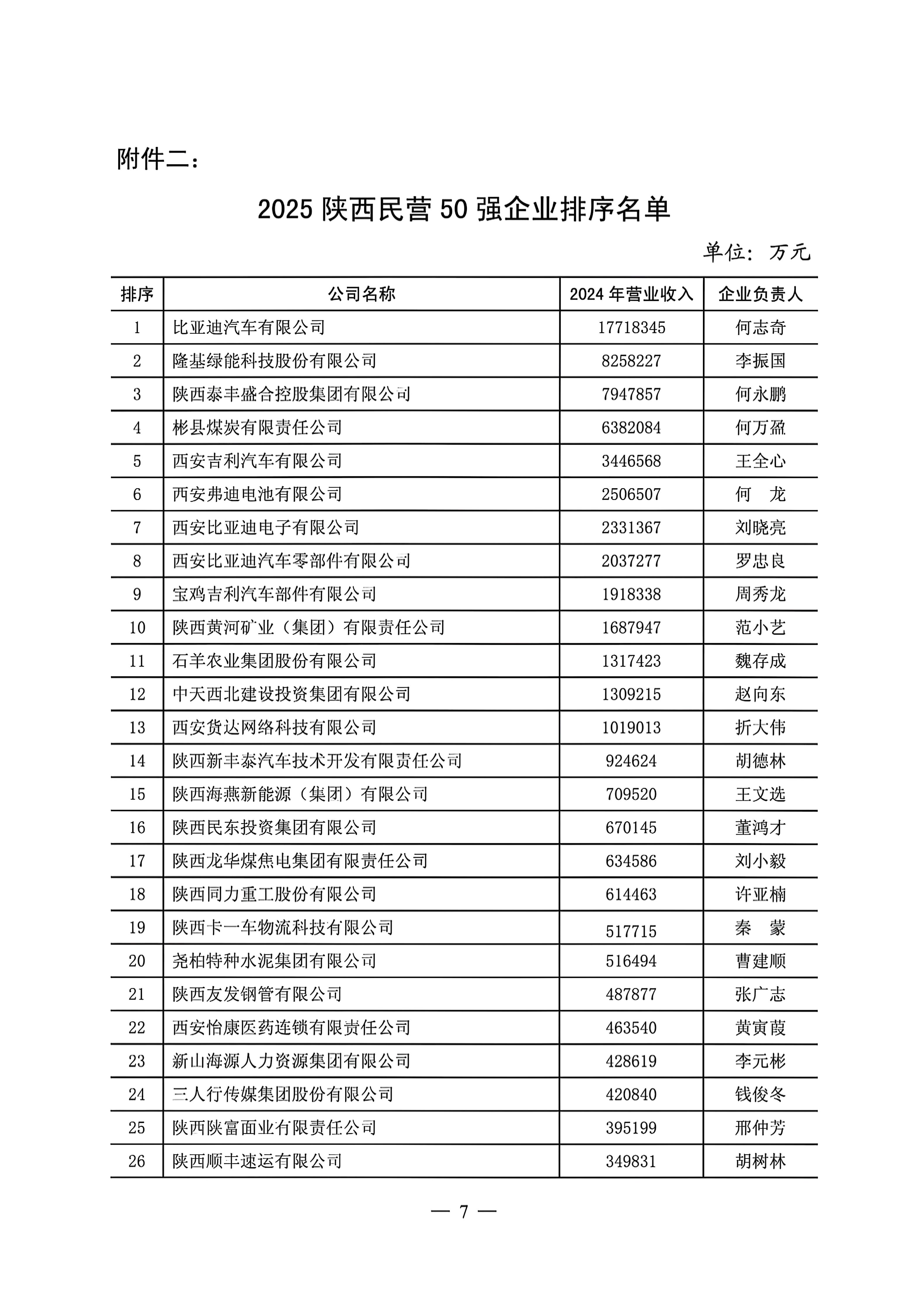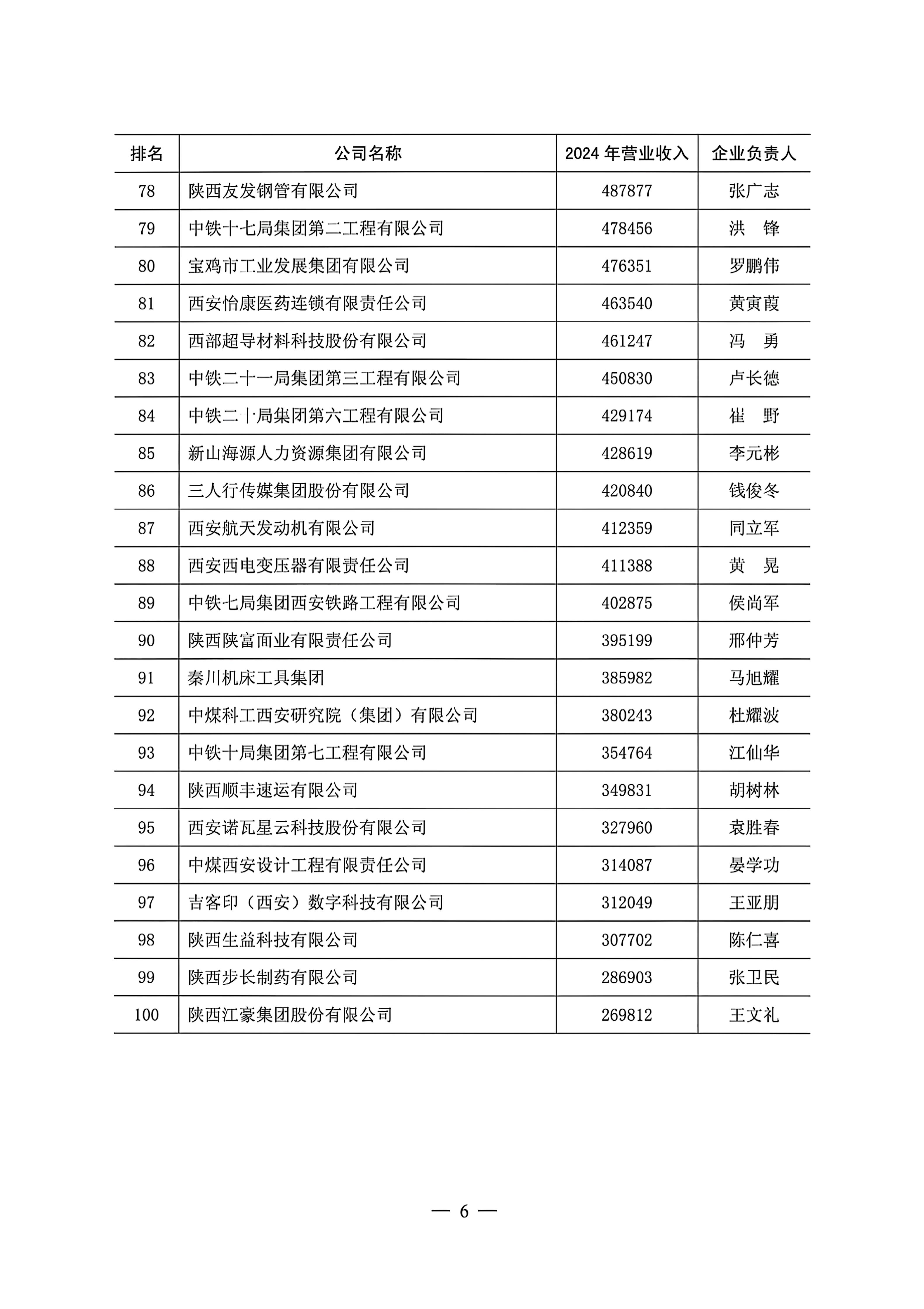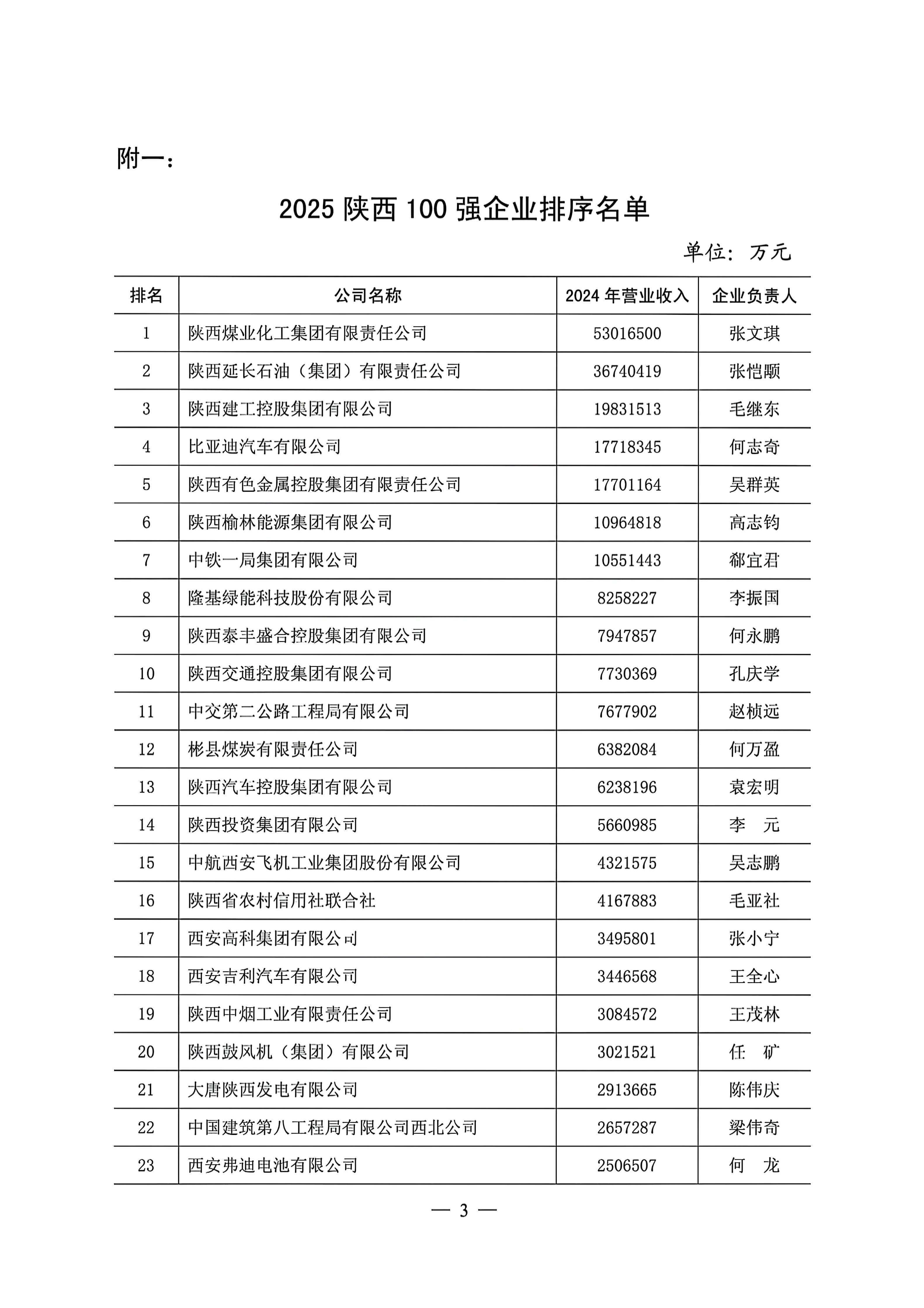 2025年,在陕西省发改委、工信厅、财政厅、人社厅、商务厅、国资委、统计局、省委金融办、省总工会等部门的大力支持下,陕西省企业家协会继续组织开展了2025陕西100强企业和陕西民营50强企业排序工作并编印了《2025陕西100强企业分析报告》。 2025陕西100强企业及民营50强企业排序是按照国际通行的方式,参照中国500强企业排序办法,坚持公平公正、不向企业收取费用等原则,依据企业2024年度营业收入,在企业自愿申报的基础上进行排序,并经“陕西省100强企业审定委员会”审定后产生的。现将排序名单予以公布。