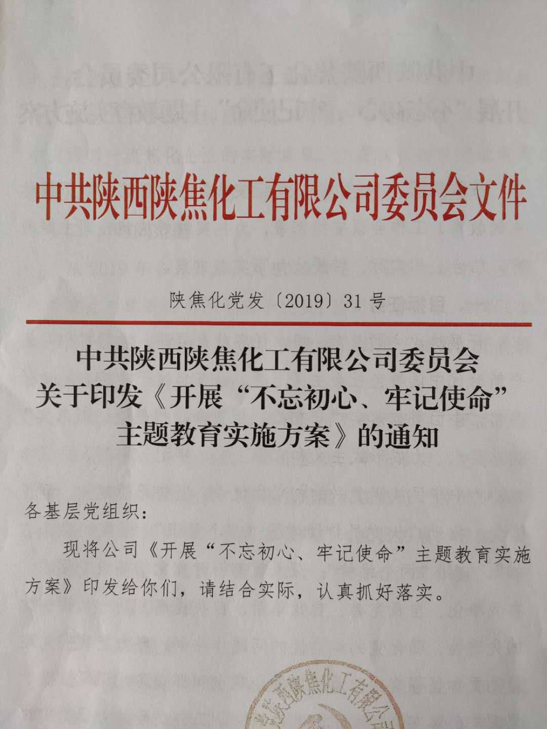 陕焦公司党委制定下发了《开展“不忘初心、牢记使命”主题教育实施方案》、《关于成立“不忘初心、牢记使命”主题教育领导小组及相关工作机构的通知》、《“不忘初心、牢记使命”主题教育巡回指导督导工作实施方案》、《“不忘初心、牢记使命”主题教育四个专项工作安排》四份文件,明确了目标、制定了措施、细化了任务、夯实了责任,通过设立领导小组及相关工作机构使主题教育工作方方面面各负其责,密切配合,切实把主题教育与推进高质量发展紧密结合起来,