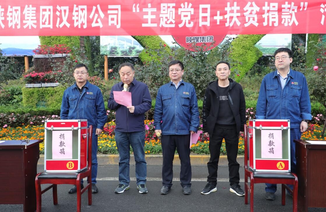 10月16日上午,在全国第六个扶贫日来临之际,陕钢集团汉钢公司在管控楼前举行了“主题党日+扶贫捐款”活动,用实际行动号召公司上下大力弘扬社会主义核心价值观,倡导扶贫济困的优良传统,为困难群众送温暖、献爱心,为坚决打赢脱贫攻坚战作出积极贡献。公司党委副书记、总经理顾兴钧,党委委员、纪委书记蒋建波、工会主席屈海涛,总经理助理王奎,党委委员房金乐及机关各部门、基层党委代表近100人参加了活动。