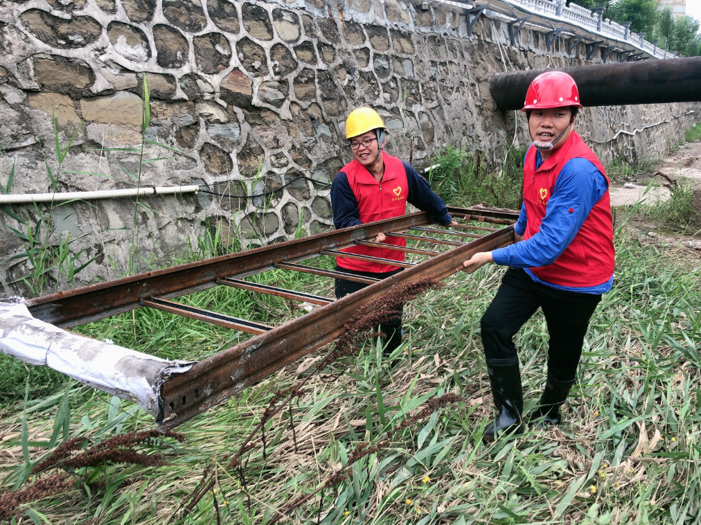 下午4时,大家穿好雨鞋,带上镰刀、垃圾桶,穿上志愿者红马甲,开始清理河道淤泥、杂草、垃圾。清理至闸阀孔洞处,发现孔洞出口处杂物已将洞口堆满,大块木板斜插卡住,造成大量杂物推挤,堵塞闸道,无法正常进水。闸道口正处河道面中心位置,要想打通闸道必须有人下到河道里面。“来,王张俊帮忙搭梯子,陈彦龙把长镰刀拿来,高强军将勾出的木板、杂物清理到河道边,我先下去”这时该车间党支部书记张喜林、管理人员孙金平一马当先,率先下到河道里,经过1个半小时的清理,大家共计清理淤泥面积约100m2,杂草、杂物3车。