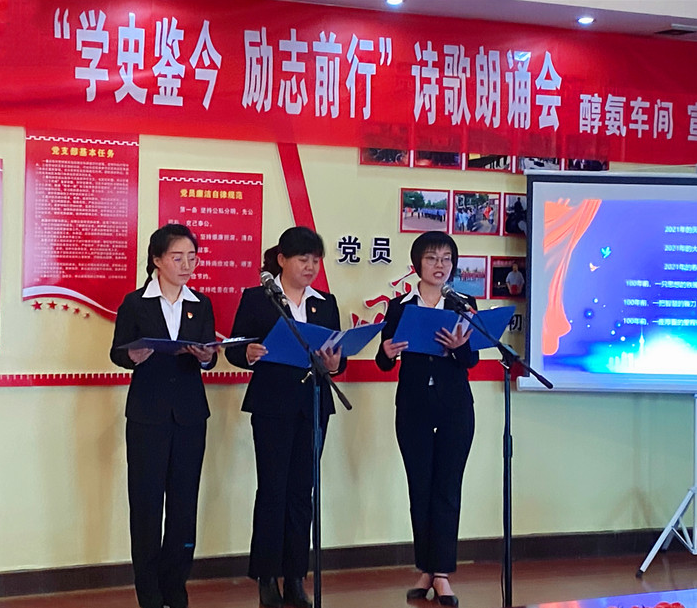 不仅如此,据该公司炼焦一车间党支部书记介绍,为使全体党员学好党史,学懂党史,车间党支部常态化组织开展“每周微信读原文”活动,通过每周指定一名党员骨干以班前班后会、教育培训会、周例会等为学习平台,采取面对面的诵读和微信语音诵读等方式,组织员工开展党史学习教育,营造了“人人学党史”的良好学习氛围;醇氨车间党支部组织开展了“学史鉴今,励志前行”主题诗歌朗诵会,党员们以饱满的精神、生动的语气、抑扬顿挫的朗诵将一首首红色诗歌的精髓淋漓尽致的表达出来,为观众带来了一场歌颂党、歌颂祖国的诗词盛宴。