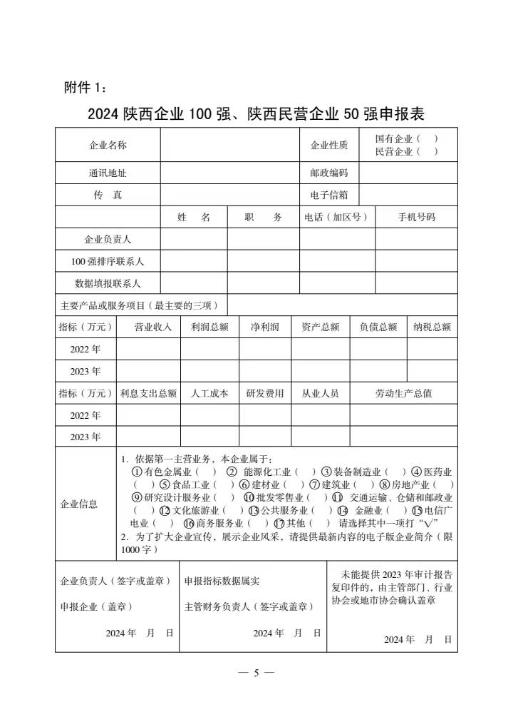 附件1: 2024陕西企业100强、陕西民营企业50强企业申报表