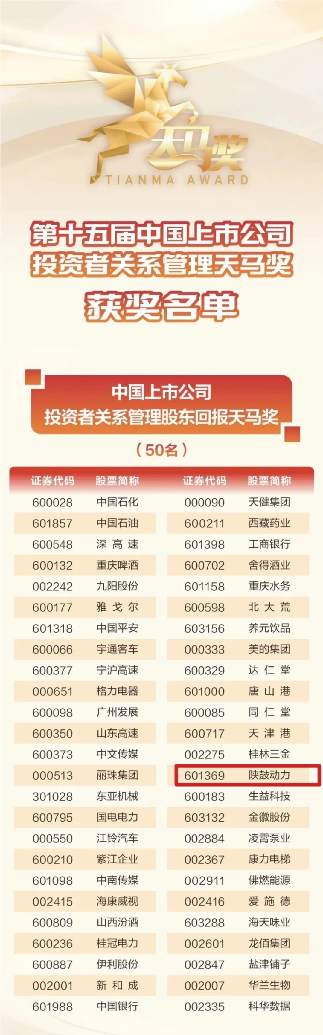 近日,第十五届中国上市公司投资者关系天马奖荣耀盛典在湖南长沙举行。陕鼓动力凭借在投资者关系领域的卓越表现,荣获“中国上市公司投资者关系管理股东回报天马奖”。陕鼓动力总经理陈党民代表企业上台领奖。 天马奖致力于提高上市公司对投资者的服务意识,提升投资者关系管理水平,传播上市公司内在价值,是中国资本市场具有广泛影响力的投资者关系评选之一。 本次评选历经财务合规筛查、专家评审、监管部门复核等多个环节,从投资者关系维护、财务质量、市值管理、投资者回报、ESG表现五大维度对上市公司投资者关系管理水平进行评选。中国上市公司投资者关系管理股东回报天马奖在数千家上市公司中共评选50家,经层层筛选,陕鼓动力脱颖而出。未来,陕鼓动力将继续以高质量发展回馈社会,回报股东,为社会经济发展贡献力量。