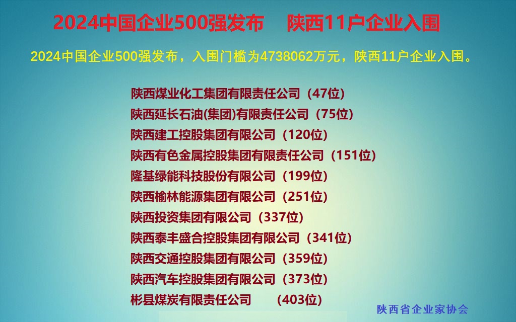2024中国企业500强发布,入围门槛为4738062万元,陕西11户企业入围。