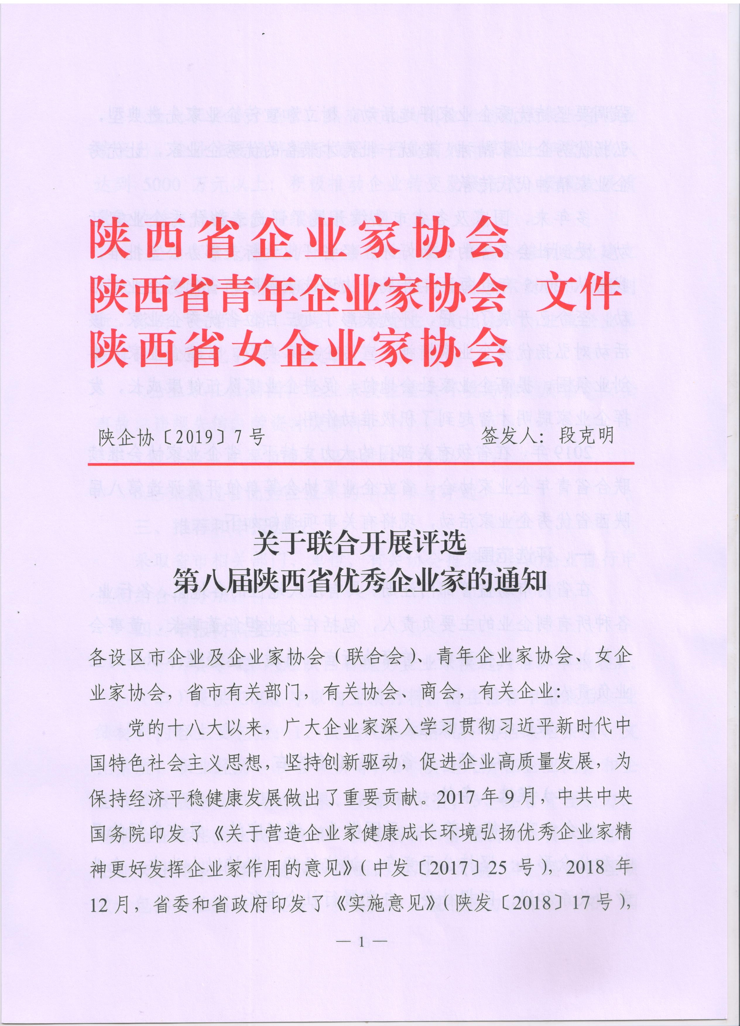 关于联合开展评选第八届陕西省优秀企业家的通知