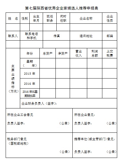 (一)填写《第七届陕西省优秀企业家候选人推荐申报表》。