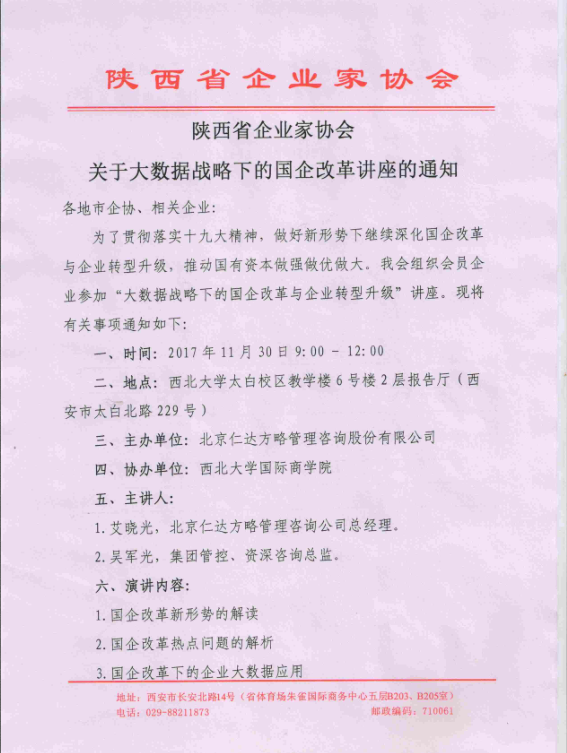 各地市企协、相关企业: 为了贯彻落实十九大精神,做好新形势下继续深化国企改革与企业转型升级,推动国有资本做强做优做大。我会组织会员企业参加“大数据战略下的国企改革与企业转型升级”讲座。现将有关事项通知如下: 一、时间:2017年11月30日9:00 - 12:00 二、地点:西北大学太白校区教学楼6号楼2层报告厅(西安市太白北路229号) 三、主办单位:北京仁达方略管理咨询股份有限公司 四、协办单位:西北大学国际商学院 五、主讲人: 1.艾晓光,北京仁达方略管理咨询公司总经理。 2.吴军光,集团管控、资深咨询总监。 六、演讲内容: 1.国企改革新形势的解读 2.国企改革热点问题的解析 3.国企改革下的企业大数据应用