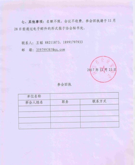 七、其他事项:名额不限,会议不收费。参会回执请于11月28日前通过电子邮件的形式报于协会秘书处。 联系人:王韬 88211873,18991797933 邮 箱:359799385@qq.com 2017年11月23日 参会回执 单位名称 参会人姓名 职务 联系方式