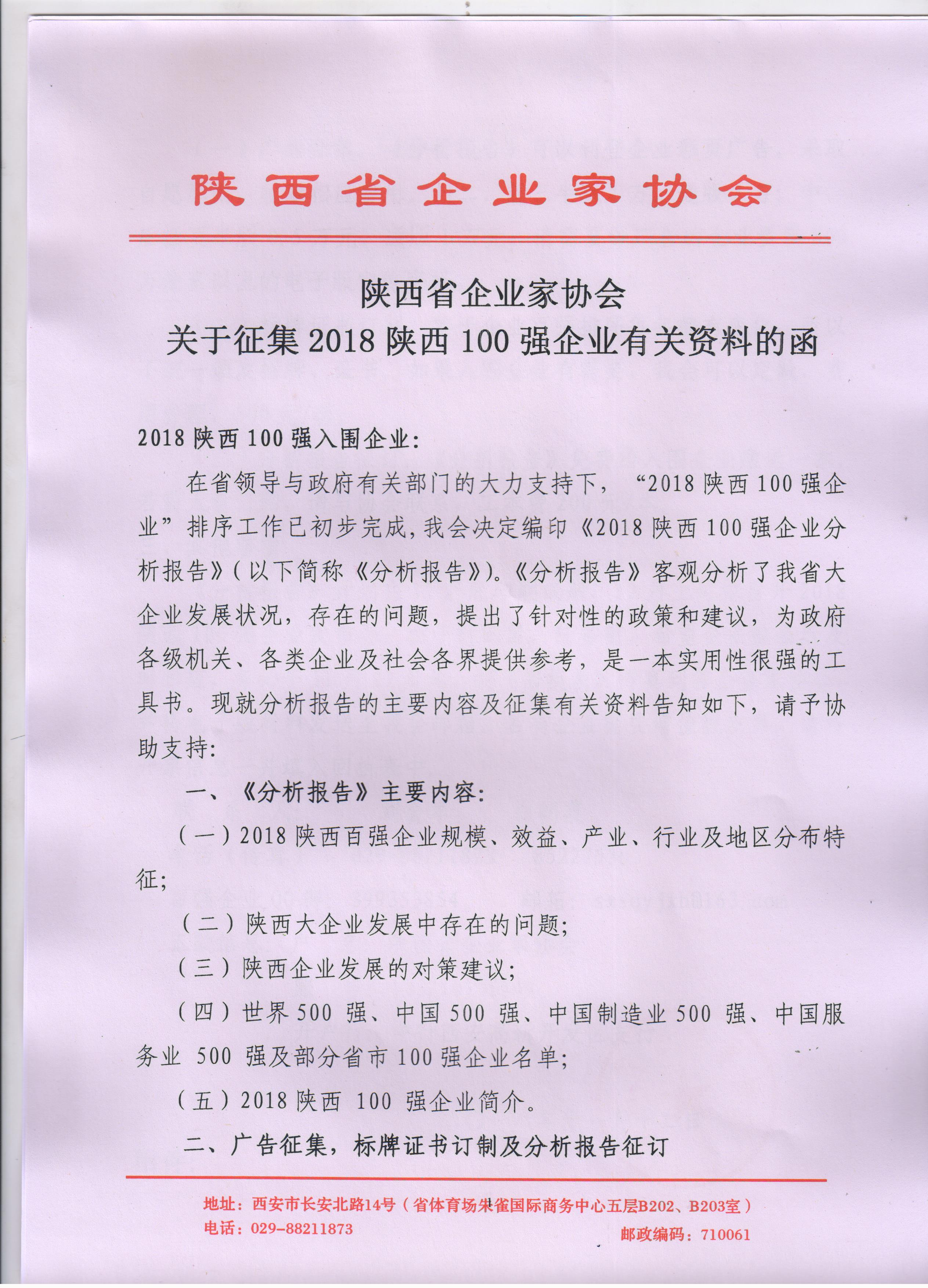 陕西省企业家协会关于征集2018陕西100强企业有关资料的函