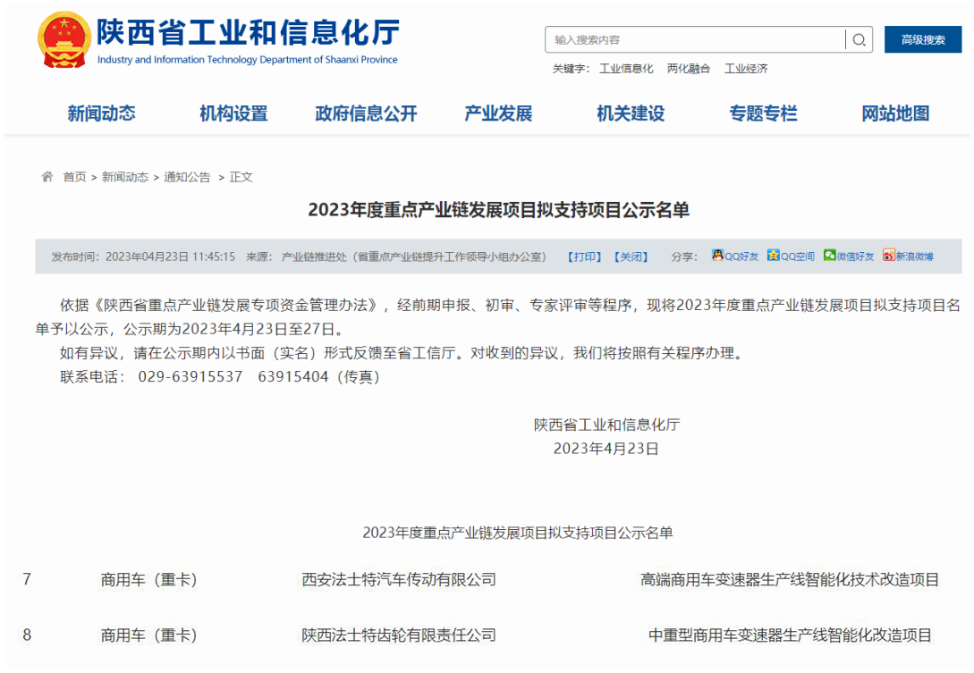 近日,从陕西省工业和信息化厅传来喜讯:西安法士特汽车传动有限公司《高端商用车变速器生产线智能化技术改造项目》、陕西法士特齿轮有限责任公司《中重型商用车变速器生产线智能化改造项目》成功入选2023年度全省重点产业链项目。 2023年度重点产业链发展项目拟支持项目,依据《陕西省重点产业链发展专项资金管理办法》,经前期申报、初审、专家评审等程序评选而出。 近年来,法士特始终围绕汽车产业链,集中优质资源合力推进关键核心技术攻关,稳步提升高端化、智能化、绿色化水平,推动企业数字化、智能化转型升级,企业生产经营稳步提升,实现高质量发展。