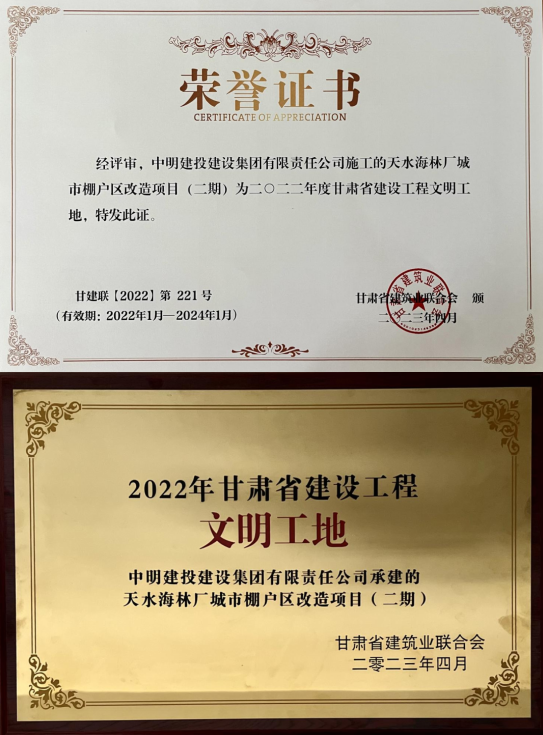 天水海林厂建设项目从成立项目部起,就组建了由项目经理任组长的创建文明工地领导小组,明确创“市、省级文明工地”目标。项目部群策群力,精心谋划,科学部署,制定创优方案,严格按照公司的项目标准化进行管理,建立健全各项制度,建设过程中扎实开展文明工地创建和安全文明施工标准化、常态化、系统化工作,在历经层层考核及检查后收获了这份来之不易的荣誉。 天水海林厂项目获“省级文明工地”称号,既是海林厂项目部落实集团项目标准化管理的成果体现,也是集团近年来大力推进项目创优夺杯战略,提升创优质量的典型案例,为争创天水建设工程“麦积奖”创造了有力条件。 该项目施工目前接近完工,海林厂项目部将保质保量做好各项收尾工作,向业主单位交上一份满意的答卷,树立集团项目建设的新标杆。4月26日,甘肃省建筑业联合会召开2022年“甘肃省建设工程文明工地、绿色建造施工水平评价合格项目、BIM+智慧工地示范工程、诚信建造师”表彰大会,我集团承建天水海林厂城市棚户区改造项目(二期),继获市级文明工地后,又荣获“甘肃省建设工程文明工地”荣誉称号。集团副总经理兼甘肃分公司经理安建成、甘肃分公司副经理王杰代表集团参会并领取奖牌。