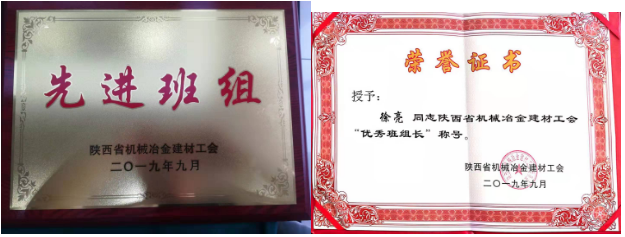 公司炼钢厂连铸车间1#机乙班喜获“陕西省机械冶金建材工会先进班组”荣誉称号,轧钢厂轧机装配车间机加班班长徐亮喜获“陕西省机械冶金建材工会优秀班组长”荣誉称号。