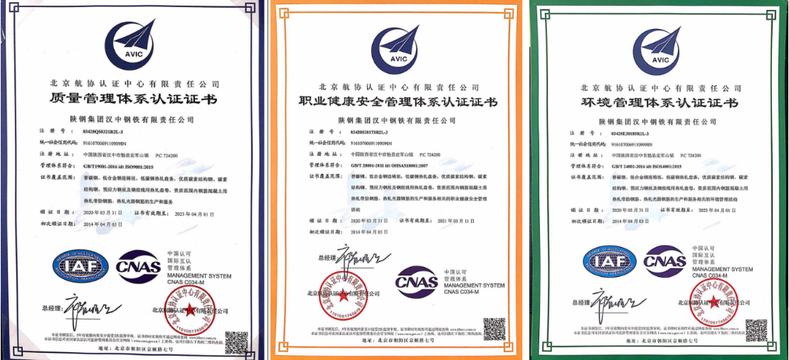 4月16日,陕钢集团汉钢公司收到北京航协认证中心有限公司认证颁发的质量、环境、职业健康安全管理体系认证证书,标志着公司一体化管理体系进入了一个新的阶段。公司产品完全符合GB/T19001-2016《质量管理体系要求》、GB/T24001-2016《环境管理体系要求及使用指南》,GB/T28001-2011《职业健康安全管理体系要求》标准,企业在生产经营各环节、各种行为,尤其是在经营管理、质量、环保、职业健康卫生、安全生产体系运行方面,基本满足国家对钢铁企业的管理要求,为公司高效生产经营奠定了科学管理基础。
