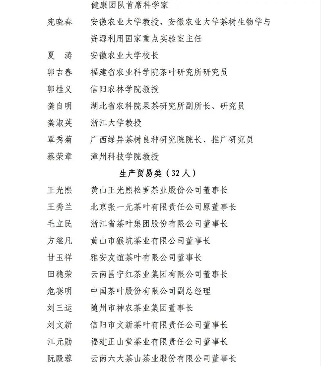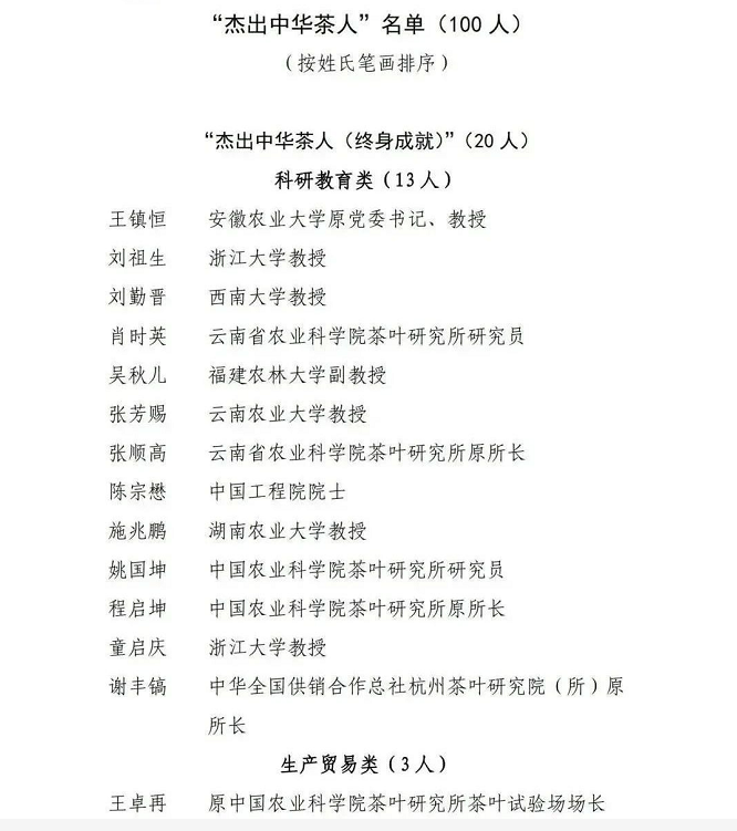 (11月6日),茶界年度重磅消息:100名“杰出中华茶人”名单在福建省福州市隆重颁布。 其中,中国工程院院士陈宗懋、湖南农业大学教授施兆鹏等20位德高望重的老前辈、老专家获评“杰出中华茶人(终身成就)”,中国工程院院士刘仲华、安徽农业大学教授宛晓春、泾渭茯茶董事长纪晓明等来自17个省、市、自治区以及中国澳门、中国台湾地区对茶产业做出突出贡献的代表性茶人荣获“杰出中华茶人”。 “杰出中华茶人”推选活动自今年3月份启动,覆盖茶叶科研教育、生产贸易、产业发展三大领域。这场历时半年之久,经过层层评审推出的100名“杰出中华茶人”,在业内发挥着“头雁效应”,为中国茶产业的跨越式发展做出了不懈努力。