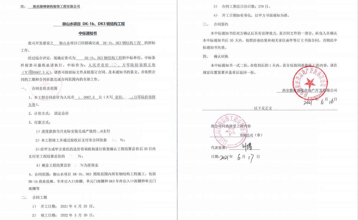热烈祝贺雄峰集团6月接连中标:中海曲江大城钢结构工程、远洋地产御山水钢结构工程、科为瑞府工程项目。