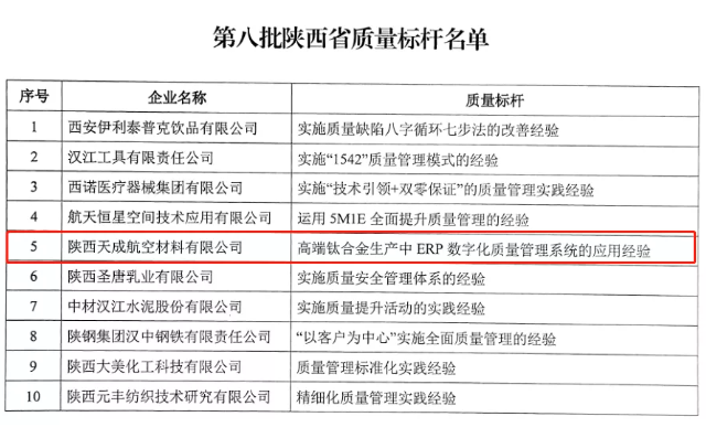 近日,陕西省工业和信息化厅正式公布第八批陕西省质量标杆名单。经企业申报、地市推荐、专家评审等环节层层筛选,全省10家企业获评,天成航材凭借“高端钛合金生产中ERP数字化质量管理系统的应用经验”成为 陕西新材料领域唯一质量标杆企业。 天成航材自2007年成立以来,长期承担航空、航天、船舶等高技术领域钛材科研生产任务,并充分利用现代化信息技术优势,以智能化、自动化技术改造传统产业。 公司逐步建立完善了 ERP数字化质量管理系统 的设计、改良和应用,实现成本引领、精准控制、综合管理、深度挖潜的产品质量创新管理模式,兼顾钛合金产品质量与生产效率,实现了企业管理水平的大幅提升。 据了解,陕西省工业和信息化厅举办质量标杆评选活动,旨在加强工业质量品牌建设,引导企业“学标杆、做标杆、超标杆”,建立健全质量体系,全面提升全省企业质量管理水平。此次荣获2021年全省质量标杆,是省工信厅对天成航材质量管理水平的高度认可和肯定,对公司未来质量创新和产品转型意义重大。 未来,天成航材也将 深入做好质量创新,持续探索企业特色管理模式 ,切实发挥好“质量标杆”的引领作用。