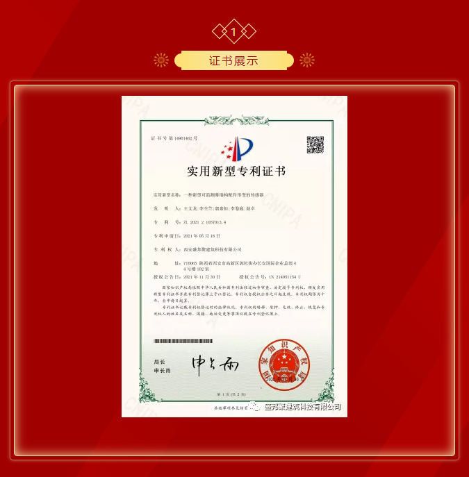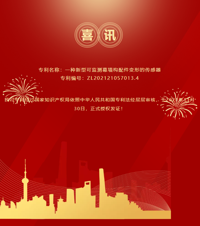 喜讯 | 热烈祝贺我盛邦聚建筑科技有限公司成功获取首项实用新型专利——一种新型可监测幕墙构配件变形的传感器
