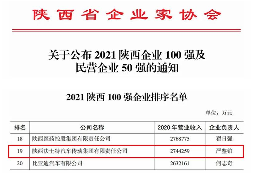 又讯:12月28日,西安企业及企业家联合会发布了2021西安100强企业排序名单,陕西法士特汽车传动集团有限责任公司以274亿元营业收入位列第七位。
