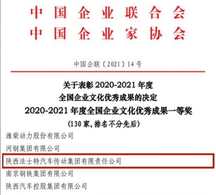 日前,中国企业联合会、中国企业家协会联合发文表彰全国企业文化优秀成果。法士特集团再次荣登榜单,法士特创新文化喜获2020-2021年度全国企业文化优秀成果一等奖。