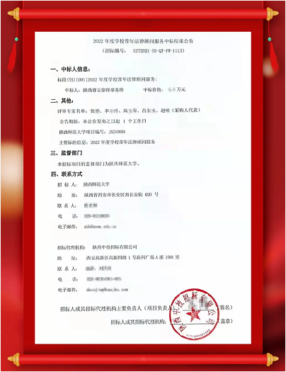 热烈庆祝我所成功中标陕西师范大学常年法律顾问服务项目,睿言律所以丰富的经验、雄厚的实力和良好的信誉,经过层层筛选角逐后,最终成功中标。成绩的取得凝聚着同事们的辛勤付出,付出终将有回报。让我们一同来分享这份喜悦,一起加油努力! 此次中标是对我所的综合实力、服务水平的又一次肯定。我所将以更专业化、标准化、高质量的服务为陕西师范大学提供全面、高效、优质的法律服务,相信在律所同仁的积极努力下,必定会乘风破浪,屡创佳绩! 潮平岸阔催人进,风起扬帆正当时。睿言将以此中标为契机,进一步凝心聚力,求真务实,为客户积极做出高质量服务。