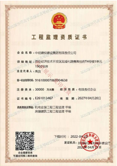 4月21日,中明建投集团取得了房屋建筑工程监理甲级、机电安装工程监理甲级两项资质,标志着中明建投集团在工程咨询服务管理方面取得重大突破。