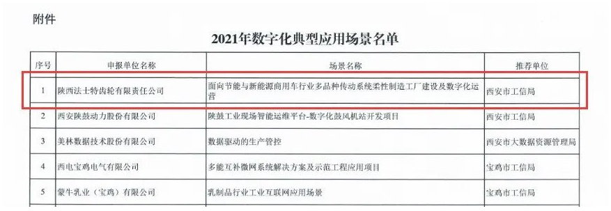 近日,陕西省工业和信息化厅2021年数字化典型应用场景授牌仪式在西安举行。陕西法士特齿轮有限责任公司“面向节能与新能源商用车行业多品种传动系统柔性制造工厂建设及数字化运营”成功入选。 该项目是法士特运用高柔性自动化、人工智能、大数据分析等技术在产品全生命周期的探索,应用场景为制造装备以及生产线的智能化升级、实现装备-物料-管理系统互联互通与高度集成、研制多品种变速器网络化协同制造云平台、建立多品种变速器制造统一管控与决策分析平台,可有效推进企业制造过程数字化设计、工艺流程优化、精益生产等的提升。 法士特将以集团“数字化赋能年”为契机,持续加大数字化信息化建设力度,积极推进数字化典型应用场景水平再提升,助推企业实现数字化转型。