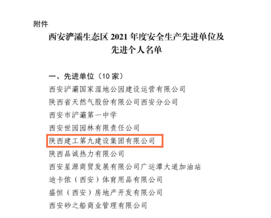 近日,九建集团被西安浐灞生态区管理委员会授予“2021年度安全生产先进单位”,也是获评的唯一一家施工单位。
