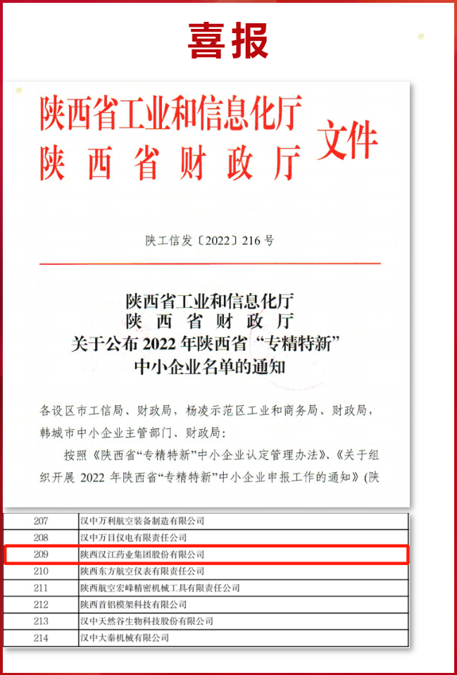 近日,2022年陕西省“专精特新”中小企业名单已正式出炉,陕西汉江药业集团股份有限公司凭借在医药制造领域优异的产品专业和研发创新能力被认定为省级“专精特新”企业称号。 “专精特新”项目是国家重点培育工程,旨在通过“专精特新”体系重点培育一批具有“专业化、精细化、特色化、新颖化”的优势中小企业成为行业细分龙头、隐形冠军和单项冠军,提升中小企业核心竞争力,推动经济高质量发展。能够入选“专精特新”的企业,大多具备较强的研发实力,其产品或服务具有一定的市场占有率、行业影响力和发展潜力。 “专” “精” “特” “新” “ 专 ”•陕西汉江药业集团股份有限公司成立于1970年,公司50多年来,一直致力于原料药生产与销售,企业在化学药品原料药制造领域,在国际市场销售与开发方面有50多年的深厚积累。 “ 精 ”•“汉药”牌产品在国际市场享有较高的品牌荣誉与认可度。企业多年来,坚持“立足国内,面向世界,精制药品,造福人类”的经营战略,一直坚持精细化生产与管理,以高技术、高端化产品为主,参与国际竞争。 “ 特 ”•1983年参与国际合作,开始国际市场销售,是国内最早进行原料药出口销售的企业之一;企业主导产品之一为全球独家规模化生产,出口销售,市场保持稳定增长。 “ 新 ”•汉江药业是以特色、高端原料药生产与销售的高新技术企业,公司近2年研发投入占营业收入均超过5%,拥有院士工作站、陕西创新技术药物研究中心、陕西医药化工工程技术研究中心、甾体激素类原料药研发创新团队、市青年科技创新团队等创新研发平台,企业有非常强的技术创新与研发实力。 未来,汉江药业将始终把科研创新当作企业的未来,不断加强医药制造领域的产品与技术积累,保持企业在专业细分领域的领先水平和后续持续发展,发挥“专精特新”企业的示范与带头作用,为我省及地方经济高质量发展做出更大贡献。