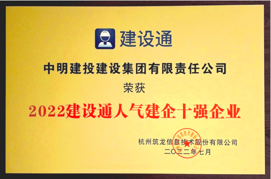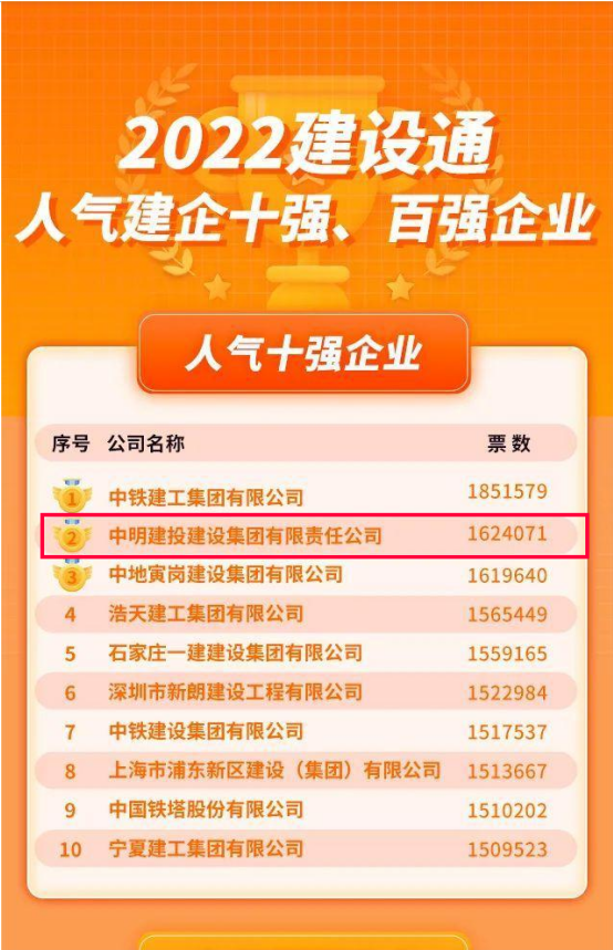 近日,建设通举办的“2022年人气建企”评选活动,经过组委会的严格筛选和十天如火如荼的投票环节,中明建投集团在全国众多建企里脱颖而出,荣获“2022年人气建企十强企业”。