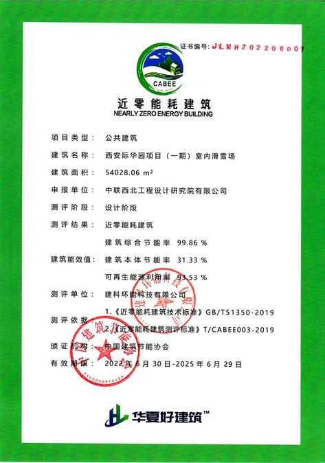 日前,中联西北院华盛所设计完成的西安际华园项目(一期)室内滑雪场项目获得中国建筑节能协会颁发的近零能耗建筑认证。建筑综合节能率为99.86%,建筑本体节能率为31.33%,可再生能源利用率为93.53%,满足《近零能耗建筑技术标准》GB/T51350-2019。 西安际华园项目(一期)室内滑雪场位于西安市秦汉新城景致一路以南、兰池四路以北、酒庄路以西、张裕路以东,总建筑面积 54028.06 平方米,占地面积 63886.23 平方米(约 96 亩);容积率 0.846,建筑密度 37.31%,绿地率 25.02%,是西北地区首座集室内滑雪、滑冰、综合运动休闲为一体的大型公共运动场馆。 际华园项目(一期)室内滑雪场是集室内滑雪、室内滑冰、运动休闲以及生活配套于一体的多功能大型场馆建筑,呈现出功能类型多、空间跨度大、结构超限复杂、性能需求差异大、运行能耗高等特点,如室内滑雪馆常年需要维持-3℃的特定功能需求,综合训练馆、配套设施和室内真冰馆为常规温度需求区。因此,在满足不同功能需求的前提下,最大限度的降低建筑能耗和控制建筑成本是该项目需解决的核心问题。 设计团队通过超低体型系数和窗墙比为建筑能耗控制打好基础,针对不同功能需求量体裁衣,利用室内滑雪场的特殊大跨度结构体系形成的空间特点精心策划合理布局,将主要功能空间划分为4个独立气密区避免相互影响,结合极具针对性的围护结构设计和关键部位冷热桥设计降低建筑本体能耗,采用满足不同功能空间需求的高效空调系统降低建筑综合能耗,辅助条件极佳的屋面太阳能光电一体化系统提高可再生能源能利用率,最终解决项目不同功能空间的冷热需求问题、能耗问题以及成本问题,实现近零能耗建筑设计诉求。