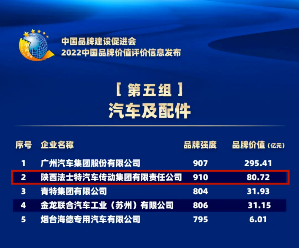 9月5日,“2022中国品牌价值评价信息”在北京发布,陕西法士特汽车传动集团有限责任公司品牌强度910、品牌价值80.72亿元,荣登汽车及配件领域榜单第2名。 法士特集团作为中国汽车工业30强、中国机械工业100强企业,始终坚持“民族品牌、世界品质”理念,自主研发推出的AT、AMT、液力缓速器及新能源汽车传动系统等智能化产品,在品牌效应、质量性能、节能环保等方面竞争优势突出。目前,企业产品已被国内外150多家主机厂的上千种车型选为定点配套产品。 据悉,“中国品牌价值评价信息发布”遵循国际标准和国家标准,坚持“科学、公正、公开、公认”的工作原则,得到社会广泛关注和认可。