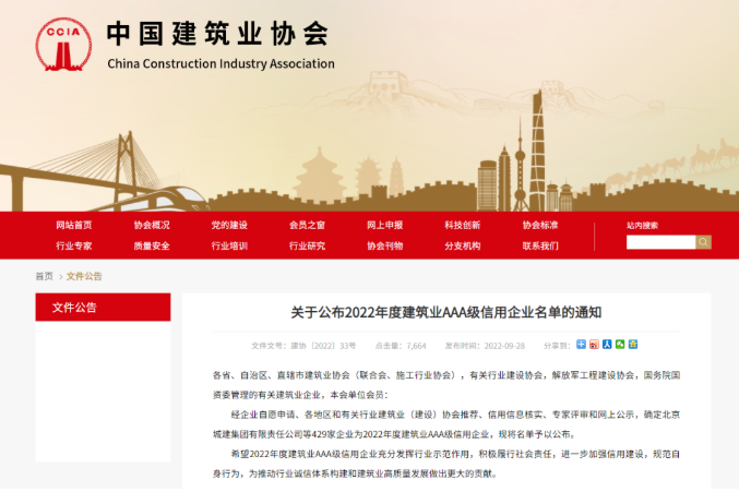 9月28日,中国建筑业协会发布2022年度全国建筑业AAA级信用企业评价结果,中国能建葛洲坝三公司凭借优良的经营业绩和完善的诚信体系,荣获2022年度“建筑业AAA级信用企业”称号,这也是公司第2次上榜获此殊荣。 全国建筑业企业信用评价,按照企业基本素质、经营能力及财务指标、管理指标、竞争力指标、市场行为指标等内容,将其企业信用分为 AAA、AA、A、B、C 三等五级,该信用等级证书是目前市场准入、招投标工作、企业评优工作的重要参考依据,其信用评价有效期为三年,是建筑行业信用最高奖项,旨在使守信企业充分发挥诚信自律示范带头作用,弘扬诚信经营、有序竞争的行业风气,切实提高工程质量和安全管理水平,推动我国建筑业高质量发展。 获评 AAA 级表明授信单位诚信度很高,各项指标优秀,企业素质很高、诚信意识很强、经营状况很好、履约能力很强、社会信誉很好,也是对建筑企业在工程建设行业中诚信经营、积极履行社会责任的高度认可,对企业广泛开拓市场、承揽业务、拓宽经营领域、提高竞争优势具有重要意义。 近年来,围绕“诚信经营、合规管理”主题,公司以“法治央企”“大风控体系建设”为抓手,深入宣贯诚信理念,持续完善信用管理体系,充分发挥信用体系运转效果,扎实推进各项信用管理工作。持续完善诚信建设制度,将诚信教育学习作为学习培训、员工教育必修课,通过开展诚信普法讲师团宣讲、法治项目创建、送法下基层、以案说法等诚信法治文化活动,断提高全员诚信合规意识和企业诚信经营水平,取得了丰硕成果,有力维护了企业品牌形象和良好信誉。