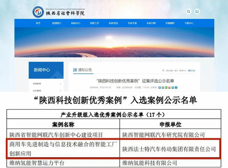 近日,陕西省社会科学院公布了“陕西科技创新优秀案例”征集评选公示名单,法士特集团的“商用车先进制造与信息技术融合的智能工厂创新应用”案例入选产业升级组优秀案例名单。
