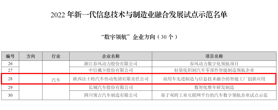 日前,工业和信息化部发布了《关于2022年新一代信息技术与制造业融合发展试点示范名单的公示》。法士特集团申报项目“商用车先进制造与信息技术融合的智能工厂创新应用”成功入选“数字领航”企业方向试点示范名单。 据悉,“数字领航”企业方向2022年首次被提出,目的是打造一批技术实力强、业务模式优、管理理念新、质量效益高的制造业数字化转型标杆。本次全国有30家企业入选“数字领航”企业,其中汽车行业仅5家。 近年来,法士特积极响应国家号召,秉承“以智能制造为主攻方向,坚定不移建设制造强国”的初心,以制造模式高效升级、精细化管理高水平推进、流程化组织高度变革的重大战略举措为抓手,将高智新智慧工厂建设为企业数字化转型的样板工程,推动企业高质量发展。
