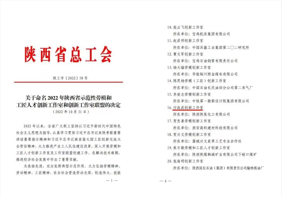 近日,从陕西省总工会获悉,陕焦公司付战武创新工作室被命名为陕西省示范性劳模创新工作室,这也是陕西省授予劳模创新工作室的最高荣誉。 付战武创新工作室于2018年6月挂牌成立,带头人付战武曾荣获陕西省三秦工匠、陕西省五一劳动奖章、陕西省带徒名师等多项荣誉。工作室现有成员13名,其中高级技师6名,技师2名,工段长、维修班长3名,工程师1名。在全体成员的努力下,2019年,工作室获得陕西省机械冶金建材工会“优秀创新工作室”荣誉称号,2021年,分别荣获陕西省冶金电气自动化创新工作室联盟成员创新工作室、全国机械冶金建材行业“创新百强班组”。 “付战武创新工作室”自成立以来,确立了“学习、培训、研究、创新”的四大功能,以“产研结合、自主创新”为宗旨,以“强化人才培养,提高经济效益和推进技术改进”为目标,开展立项创新创效活动。截至目前,该工作室在国家知名期刊发表专业论文四篇,其中,一项推焦及装煤车行程控制系统研究与应用荣获陕西省职工优秀创新成果优秀奖,取得实用新型专利5项,发明专利1项。先后完成技术创新改造20余项,在《推焦装煤车PLC在线运行监控系统》《堆取料机控制信号无线数传系统改造》《焦化系统推焦及装煤车行程控制系统改造》等20余项改造方面取得了显著的成就,累计为企业创造效益1500余万元。编写完成《岗位练兵培训制度》《技能比武操作项目考点要素》等培训课件数十种,为新员工的岗前教育及参赛选手赛前辅导起到积极作用。多年来已累计培养高级技师6名,技术骨干2名,大班长2名,在公司基层单位人才培养方面名列前茅。 此次付战武创新工作室成功获评陕西省示范性劳模创新工作室,不仅是对付战武创新工作室在发挥劳模示范性引领作用、集智创新、协同攻关、技能传承等方面工作的肯定,又是对该公司在弘扬劳模精神、工匠精神、劳动精神,深入开展劳模工作室创建及引领职工群众积极投身经济技术创新方面取得成绩和效果的肯定。后续,该公司工会将进一步把劳模创新工作室创建作为职工发挥才干、创新创造和展现风采的重要渠道,进一步发挥弘扬劳模精神载体、科技创新平台和高素质人才培养阵地的重要地位,持续激发职工干事创业的热情,为该公司转型发展做出新的更大的贡献。