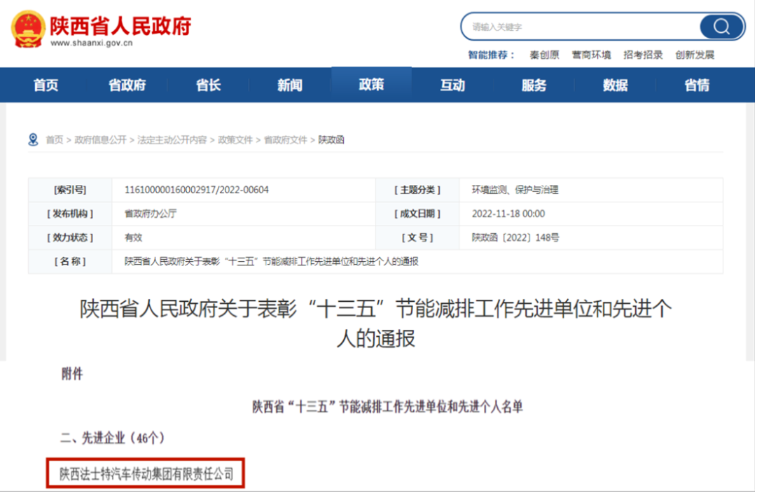近日,陕西省人民政府网站发布《关于表彰“十三五”节能减排工作先进单位和先进个人的通报》,陕西法士特汽车传动集团有限责任公司荣获“十三五”节能减排工作先进企业荣誉称号。 近年来,法士特以数字化转型为目标,推进“绿色制造”,实施“零碳工厂”,全面开启科技引领、创新驱动、技术支撑、高质量发展新征程,在品牌效应、质量性能、节能环保等方面竞争优势突出,助力企业全面适应国家节能减排和汽车产业战略发展新要求。 “十四五”期间,法士特集团将持续加大科技创新力度,在节能减排、降本增效中下足功夫,实现绿色低碳高质量发展,为碳达峰碳中和贡献法士特力量。