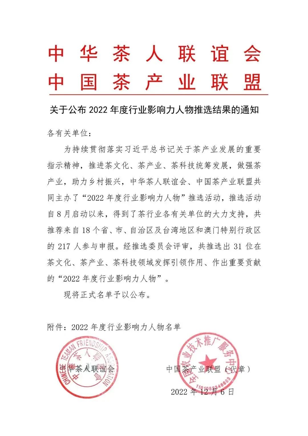 12月7日 “2022年度行业影响力人物”名单正式公布 共推选出31位 在茶文化、茶产业、茶科技领域 发挥引领作用、作出重要贡献的人物 泾渭茯茶董事长胡歆入选 “2022年度行业影响力人物”的推选 旨在持续贯彻落实 习近平总书记关于茶产业发展的重要指示精神 推进茶文化、茶产业、茶科技统筹发展 做强茶产业 助力乡村振兴 胡歆 正高级工程师 咸阳泾渭茯茶有限公司董事长 国家林业和草原局茯茶工程技术研究中心主任 中国茶叶学会优秀青年科技工作者 陕西省中青年科技创新领军人才 陕西省优秀科技新星 胡歆紧密结合我国茯茶产业领域的技术需求,针对制约产业发展的关键技术问题,调整、凝练科研方向,通过在茯茶加工理论、加工技术、加工装备、产品创新等方面的研究,取得多项生产关键技术创新突破。尤其是在创新茯茶工艺方面,开发了一系列自动化、清洁化的茯茶加工设备,以及在构建智能化、数字化绿色茯茶生产线方面,有力助推了中国茯茶行业跨越式升级发展。 其先后获科学技术奖励7项,累计发表论文20余篇,专利授权34项,参与制定行业和团体标准4项。主持完成的“陕西茯茶加工工艺关键技术研究与产业化应用”项目荣获陕西省科学技术奖二等奖;参与完成的“黑茶提质增效关键技术创新及产业化应用”项目被评为国家科学技术进步二等奖。