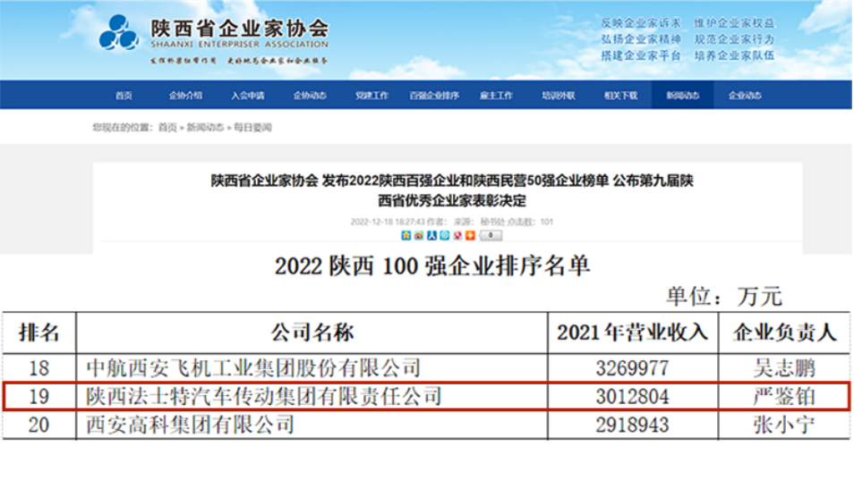 12月18日,陕西省企业家协会发布2022陕西百强企业和陕西民营50强企业榜单,公布第九届陕西省优秀企业家表彰决定。陕西法士特汽车传动集团有限责任公司荣登陕西百强榜单第19位,法士特集团总经理马旭耀获评“第九届陕西省优秀企业家”。 2021年,法士特聚焦主业,持续改革创新发展,推动数字化转型,实现稳定增长,彰显国企担当。未来,法士特将抢抓市场机遇,坚持创新发展,加快核心技术攻关,为陕西经济高质量发展贡献力量。 此次名单的发布旨在倡导时代精神,鼓励企业家攻坚克难,奋力拼搏,为陕西省经济社会发展做出新的贡献。