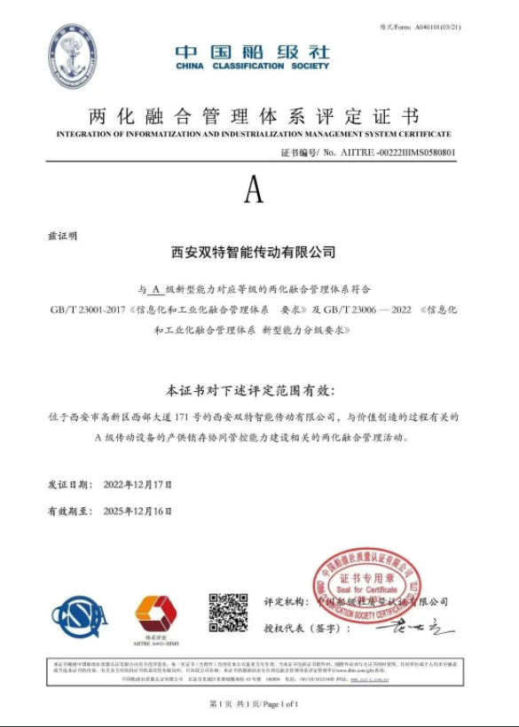 日前,双特公司获得由国家工信部授权的评定机构颁发的《两化融合管理体系评定证书》,标志着双特公司信息化与工业化深度融合迈向新阶段。