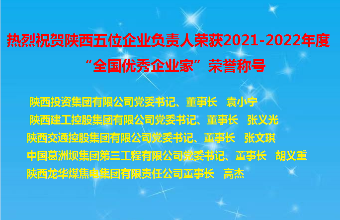 近年来,我省产业发展加速转型升级,步入高质量发展轨道,一批企业创新开拓能力日益增强,优秀企业带头人不断涌现。此次陕西获得全国优秀企业家荣誉称号的企业负责人是:陕西投资集团有限公司党委书记、董事长袁小宁,陕西建工控股集团有限公司党委书记、董事长张义光,陕西交通控股集团有限公司党委书记、董事长张文琪,中国葛洲坝集团第三工程有限公司党委书记、董事长胡义重,陕西龙华煤焦电集团有限责任公司董事长高杰。 希望获奖的全国优秀企业家能作为我省典范,进一步发挥优秀企业家敢为人先的改革创新精神,引导和激励更多企业家投身企业改革发展当中,适应新时代要求,谋求更大发展空间,迎难而上,再创佳绩,为企业做优做强做大贡献力量,为陕西经济社会发展再立新功。