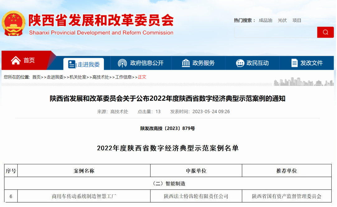日前,陕西省发展和改革委员会公布了2022年度陕西省数字经济典型示范案例名单,由省国资委推荐、法士特申报案例《商用车传动系统制造智慧工厂》成功入选。 法士特高智新工厂设计七大智能场景应用,应用六大核心技术,构建自动化、稳定化、柔性化工艺系统,全方位打造汽车传动领域智能制造的新模式,生产效率提高70%以上,能源消耗降低14%,人均产值提高5倍多。目前,“智慧工厂”通过设计搭建全流程的自动化生产线,做到全程无人工干预,全天候、全时段生产不停,真正满足“黑灯工厂”的要求。 未来,法士特将持续推进数字化转型走深走实,推动数字技术与生产经营深度融合,提升生产能力和生产质量,为促进全省数字经济高质量发展贡献力量。
