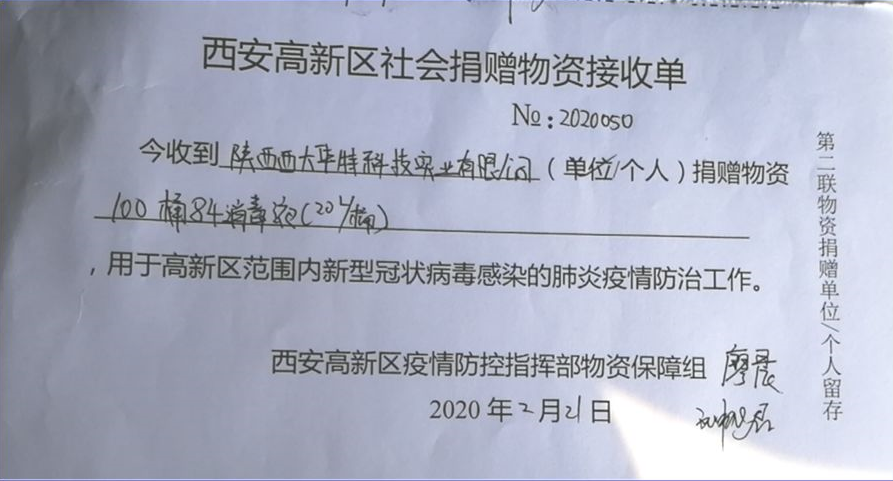 2020年2月21日,陕西西大华特科技实业有限公司(简称西大华特)向西安高新区管委会捐赠2吨自行生产的环境消杀产品,以保障西安高新区范围内疫情防控的日常消杀工作。