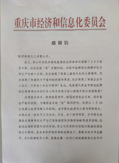 “在新冠肺炎疫情防控最吃紧的时刻,贵公司在自身防护物资紧缺的情况下,果断向我市伸出援手,及时捐赠医用口罩,再此,我委谨代表全市煤电能源供应保障单位对你们的关心和支持表示衷心的感谢,并致以崇高的敬意……”近期,一封来自重庆市经济和信息化委员会的感谢信送到了陕焦公司,字里行间体现出陕渝企业间守望相助的深厚友谊。 据了解,疫情发生以来,陕焦公司积极践行“陕煤入渝”能源战略合作精神,指导下属的陕焦能源投资有限公司,在市场医用口罩销售紧俏的情况下,想方设法为重庆市煤电能源供应保障单位捐赠了20000只医用口罩,用实际行动助推陕渝能源战略合作迈向新的台阶。 2019年,陕焦公司在重庆市相关部门大力支持下,指导其所属陕焦能源投资公司租赁经营了闲置多年的重庆永荣矿业有限公司大足煤炭洗选厂,利用陕西优质配焦煤,生产冶金焦化用洗精煤产品,既盘活了数千万元国有资产,还可以安排当地一部人就业,助力重庆地方经济发展,增加地方财政税收,实现多方共赢。 2020年,陕焦公司将坚持把握“贸易做大”方向,紧抓“陕煤入渝”战略机遇,在强化实地调研了解考察的基础上,聚焦主业,开拓市场,不断总结运行经验,继续发挥公司技术优势和品牌优势,加快西南地区市场开发,为公司“焦炭做精、化工做优、贸易做大、企业做强”精准发力。