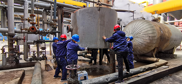 近期,陕焦公司化产二车间蒸氨岗位传来喜讯:蒸氨废水温度由原来的55℃终于降到37℃啦!此项技改标志着清洗后的蒸氨废水换热器效果达到了预期的目标。 据了解,蒸氨岗位主要负责加工焦化系统的剩余氨水,一方面利用其制取有经济价值的浓氨水,一方面使废水处理达到生化进水温度要求。长期以来,受蒸氨废水中焦油、冷却水侧结垢影响,原蒸氨废水换热器极易堵塞,换热效果和使用寿命大大降低,前期虽进行了多次尝试,但效果不甚理想,更换下的换热只能废弃,经济效益大打折扣。 现阶段正值陕焦公司 “坚决打赢生死存亡攻坚战“的关键时期,化产二车间发挥自身优势,把技术创新应用与“企业利益高于一切”和“人人都是经营者,我为陕焦做贡献”的企业文化精神结合,在革新技术工艺、提升运行质量、降低生产成本等方面不断探索、主动作为,将蒸氨废水换热器清洗纳入到攻坚行动中。 在清洗前,化产二车间结合实际,根据换热器内污垢的物化性质,对废旧换热器的清洗工艺进行大胆革新。首先,根据清洗方案,工作人员对换热器的废水侧进行了清洗,并将换热器接到粗苯系统后,再用170℃洗油清洗,换热器内附着的重质焦油经过加温、溶解过程,完全溶于洗油,再通过再生器排渣排出系统,此过程不影响粗苯正常生产;其次,通过自主配置的酸洗溶液对冷却水侧进行化学清洗,本次清洗选用化学性质稳定,腐蚀性低,清洗效果较好的氨基磺酸为主清洗剂,配用表面活性剂和剥离剂,对冷却水侧的污垢进行彻底清洗。最后,车间充分发挥横大班优势,采取“依次轮检”的方式,连续清洗48小时后,此次清洗工作有序、高效完成。清洗过程中,该车间领导亲自带队,反复推敲试验,在清洗管道设计施工、清洗工艺指标控制、粗苯系统生产调整等各个方面严格把关,确保清洗效果万无一失。 “自清洗后的旋板换热器投运后,既保证了生化进水温度,又延长了废水换热器的使用寿命,而且仅这一项,每年就能为公司节省20余万元”此项目主要负责人张鹏介绍到。 据悉,此项技术在焦化行业具有非常重要的推广价值。