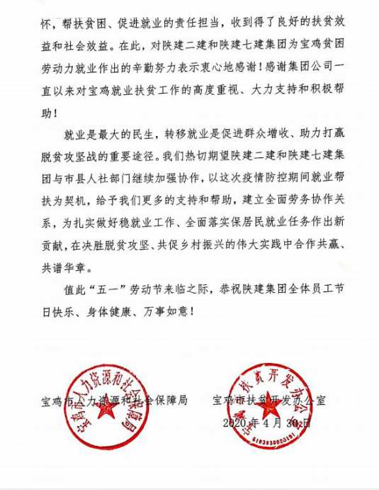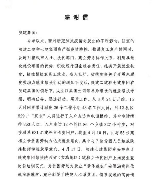 “今年以来,面对新冠肺炎疫情对就业的不利影响,驻宝的陕建二建和七建集团在严抓疫情防控、推进复工复产的同时,及时对接我市人社、扶贫部门,建立劳务协作关系,利用属地化建设项目优势,积极践行国企社会责任,扎实开展就业扶贫,精准帮扶农民工就业。......截止4月10日,共与55位建档立卡贫困劳动力达成就业意向,其中与7位贫困人员达成陕建技师学院就学意向。”这是宝鸡市人社局和扶贫办写给陕建驻宝属地化单位二建集团和七建集团的感谢信内容,字里行间表达了对陕建集团帮扶就业工作的肯定,同时,也见证了陕建集团助推全面打赢脱贫攻坚战的责任与担当。 自开展帮扶建档立卡贫困人员就业工作以来,陕建二建集团严格按照省政府稳就业助脱贫有关工作部署和陕建集团的具体要求,先后召开多次专题会议,加强和市县区人社部门对接,了解贫困人员状况。先后组织多个扶贫工作小组走村入户,宣传动员,摸底走访,电话摸排,以“就业一人、脱贫一家”为目标,急贫困户所急,帮贫困户所帮,与有就业、就学意愿贫困人员签订就业、就学协议,帮扶宝鸡地区建档立卡贫困户上岗就业任务。