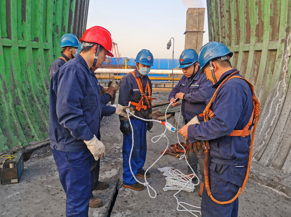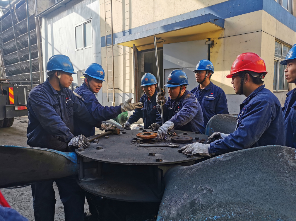 “潘主任,3#风扇已断电,一段、二段循环水已调整到位。” “收到,各岗位生产运行做好各工艺点监控,尤其要关注温度变化,发现异常及时调整反馈。” “收到!” 2020年11月7日早7:00,随着陕焦公司化产一车间3#冷却塔风扇断电,该公司冬季生产系统隐患消缺抢修工作正式拉开序幕。配合检修工作的安全监护人员、工艺处置人员、后勤人员、车间管理人员,检维修人员、气体检测人员等共计30人在化产一车间循环水处集合,全面备战检修3#风扇减速机以及更换平台任务。 此次检修任务是在风机运行且生产负荷较小时进行,为确保生产系统安全平稳运行且检维修人员能够安全保质的完成此项检修任务,该车间多次召开检修工作落实会议,分别对检修所需的备品备件及生产系统工艺处置进行逐个确认落实,对检修技术和安全进行交底,并详细分解维稳生产任务,将其落实到个人,具体到步骤 。 刚立冬的节气虽然没有寒冬时那般冷冽,但站在8米多高的循环水冷却塔上,检修人员还是禁不住打了个寒颤。7:15分,在各项安全措施以及特殊作业票证落实到位的前提下,检修人员迅速投入本次检修任务。但因需要更换的3#风扇平台使用时间较长,且长期受水雾腐蚀,护栏严重脱落且检修环境潮湿,有较大的安全隐患,为确保检修人员的安全,在严密做好安全绳、安全带的系挂后,维修人员进入风扇内部进行减速机风扇叶片整体拆除任务。固定风扇叶片、卸螺丝、放油等工作在时间的流逝中有条不紊的进行着。9:06分,风扇减速机吊出后,维修人员开始利用检修前准备好的小工具,借助千斤顶将减速机上的风扇叶片拔出,然后再将其安装到另一台减速机上;10:54风扇叶片顺利拔出,而此时循环水池的旧平台同时拆除完毕;12:48分,新制作的平台已通过吊车,吊入水池内,进行动火焊接;16:08分,新更换的3#风扇减速机以及风扇进行安装。 18:05分,维修人员在进行风扇调平工作过程中,由于联轴器过长,在正常转动过程中如果不能保证同轴度的话,有可能造成联轴器断裂、对轮磨损、减速机和电机受损,严重影响生产,所以校正调平必须精而又精,细而又细。“轴向上张口,上下差0.35mm,径向电机高3mm,先消除上张口,我先计算垫板厚度......”负责调平工作的范佳福说道。经过详细的计算,不同规格的垫片垫向电机、减速机通过近13次的校正、核算,终于在21:20实现轴向左右0.15mm、上下0.07mm,径向左右0.14mm,上下0.08mm误差,所有误差均在允许范围内;23:54分更换3#风扇减速机、平台检修任务全面完成,各项指标正常,生产系统恢复运行。 据了解,11月6日,陕焦公司开始进行为期一周的冬季设备检修工作,本次检修计划88项,主要检修作业集中在炼焦系统、化产系统、醇氨系统及水系统,截至目前,经过检维修人员及各个车间岗位人员72小时的奋战,已完成检修47项。