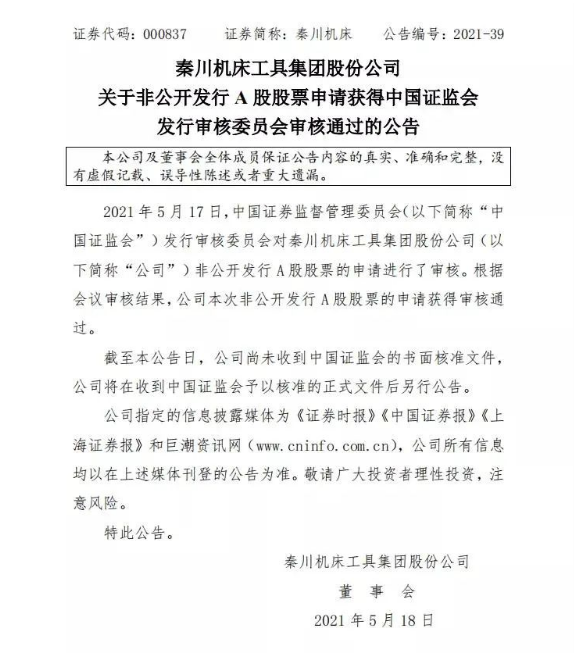5月17日,中国证券监督管理委员会(以下简称“中国证监会”)发行审核委员会对秦川机床工具集团股份公司(以下简称“公司”)非公开发行A股股票的申请进行了审核。根据会议审核结果,公司本次非公开发行A股股票的申请获得审核通过。 为抓住行业发展契机,加快提升主营业务发展,提高公司盈利能力,2020年8月,公司启动非公开发行股票事项。2020年9月14日,公司股东大会审议通过了公司非公开发行A股股票方案,公司拟向控股股东法士特集团发行股票不超过2.06亿股,募集资金总额不超过79,928万元,募集资金将用于“高端智能齿轮装备研制与产业化项目”和“高档数控机床产业能力提升及数字化工厂改造项目”,其余资金用于补充流动资金及偿还银行贷款。 本次秦川集团向法士特集团定向增发股票方案的实施,实现了法士特资本市场的新突破,将进一步提升法士特与秦川的核心竞争力,对企业高质量协同、可持续发展具有重要的战略意义。