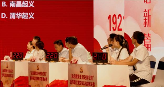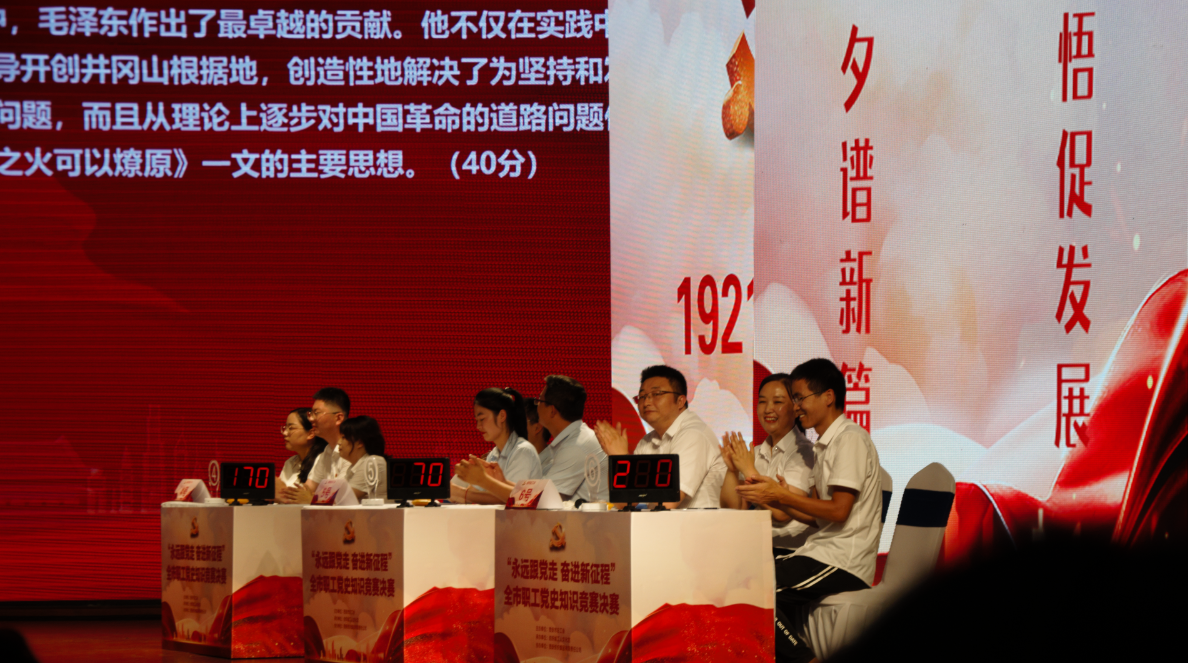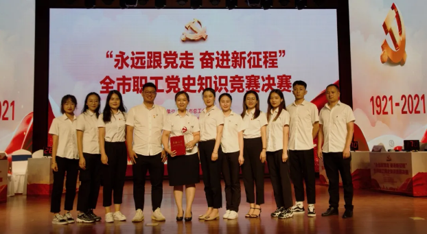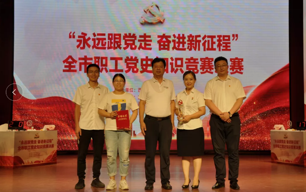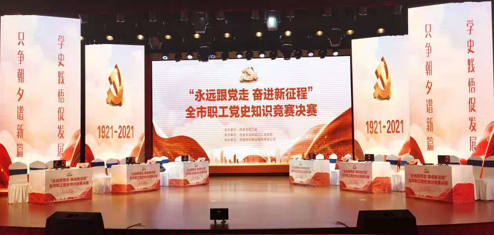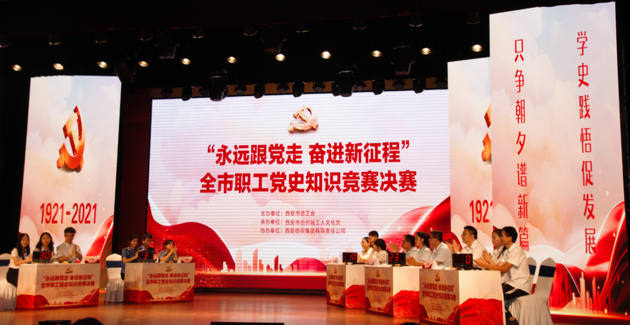 党史知识竞赛 为深化党史学习教育效果,团结引领全市广大职工群众学史明理、学史增信、学史崇德、学史力行,坚定不移听党话、跟党走。西安市总工会面向全市各区、县总工会,各产业工会,西咸新区工会,各开发区工会,各单列管理单位工会,开展了“永远跟党走 奋进新征程”全市职工党史知识竞赛线上预赛和线下决赛。 党史知识竞赛决赛 7月29日下午,由西安市总工会主办、西安市纺织城工人文化宫承办、西安纺织集团有限责任公司协办的“永远跟党走 奋进新征程”全市职工党史知识竞赛决赛在西安市灞桥区西安纺织集团报告厅顺利举行。本次参加决赛的有经开区工会工委、未央区总工会、灞桥区总工会、雁塔区总工会、莲湖区总工会、曲江新区工会6支代表队。 陕西雄峰实业集团有限公司工会是经开区工会工委下属基层工会组织,并作为经开区唯一一家非公民营企业参加了本次决赛。我集团常务副总、工会主席卜红娟等3人作为经开区工会工委代表队参赛选手参加了本次党史竞赛决赛。 ▲决赛中场互动现场 ▲经开区工会工委代表队风险题答题及评委评分 不忘初心 牢记使命 “永远跟党走 奋进新征程”全市职工党史知识竞赛决赛中,经开区工会工委代表队三位参赛选手以扎实的知识积累和紧密的团队协作,最终以总分排名第二的优异成绩荣获本次决赛二等奖。 ▲市总工会副主席冯增权向经开区工会工委代表队颁奖 知史爱党 知史爱国 以习近平新时代中国特色社会主义思想为指导,我集团工会积极响应上级工会工委的号召,通过多种形式在公司全面开展党史知识学习,引导职工重温中国共产党的光辉历程;进一步增强对党的感情,增强自信心、自豪感;坚定听党话、跟党走的意志;做到知史爱党,知史爱国;用党的光荣传统和优良作风坚定信念;感悟践行初心使命,凝聚力量、砥砺品格,为实现中华民族伟大复兴的中国梦贡献智慧和力量。 ▲雄峰集团参赛助威团合影