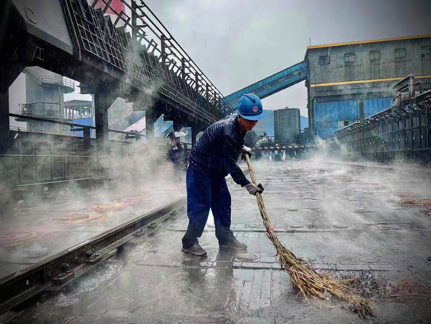 9月26日15:32分,在接班巡检时,笔者在滂沱大雨中见到了令人感动的一幕:1300℃的焦炉在雨水的冲刷下冒着阵阵热气,烟雾缭绕中,出炉工齐建建正冒着大雨打扫炉顶雨水,倾盆大雨顺着风拍打在他的脸上,模糊了他的双眼,淋湿了他的衣服,灌满他的鞋子,可他依然坚持用手中的扫帚,一下一下打扫着雨水,没有退缩,也不敷衍,用自己的一举一动诠释着爱岗,敬业。 据了解,近日连绵不断的雨水给焦炉生产带来了诸多不便,因为雨水一旦通过立火道和炭化室进入炉膛,则容易激坏铁件,降低炉温,影响焦炭成熟。为此,陕焦公司炼焦一车间二十余名出炉岗位人员不畏风雨,轮流交替为焦炉生产保驾护航。