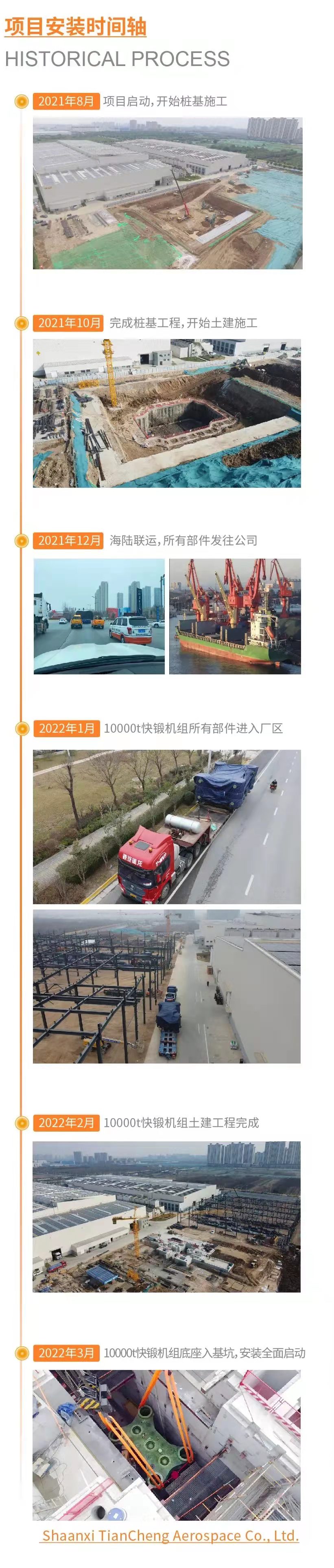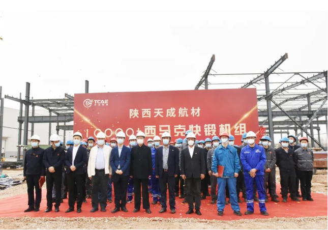 3月15日,天成航材技改扩建三期项目重磅设备——西马克10000t快锻机组安装仪式正式举办。仪式现场,195t的设备主体底座被缓缓吊起,顺利入坑安装,标志着西马克10000t快锻机组全面进入安装阶段。 设备主机为1套100MN四柱下拉式自由锻压力机,同时配套1台250KN锻造操作机。设备地面高度11.6m,地下高度17m,总重约2800t,是钛合金行业最大、最先进的快锻机组之一。 为确保这台超宽超高超重的“巨无霸”设备如期完成安装,项目团队赶工期、抓进度,历时6个多月完成设备基建,并在年末克服疫情影响,40余天日夜兼程,跨越数千公里安全运抵所有部件。 西马克10000t快锻机组将于今年7月完成整体安装并投入使用,正式投产后,可大幅提升国产钛合金制备水平和供应能力,为高端装备制造业迭代升级创造更多可能,对钛合金行业的高质量发展具有重要意义。 10000t快锻机组建设、施工、监理三方团队合影